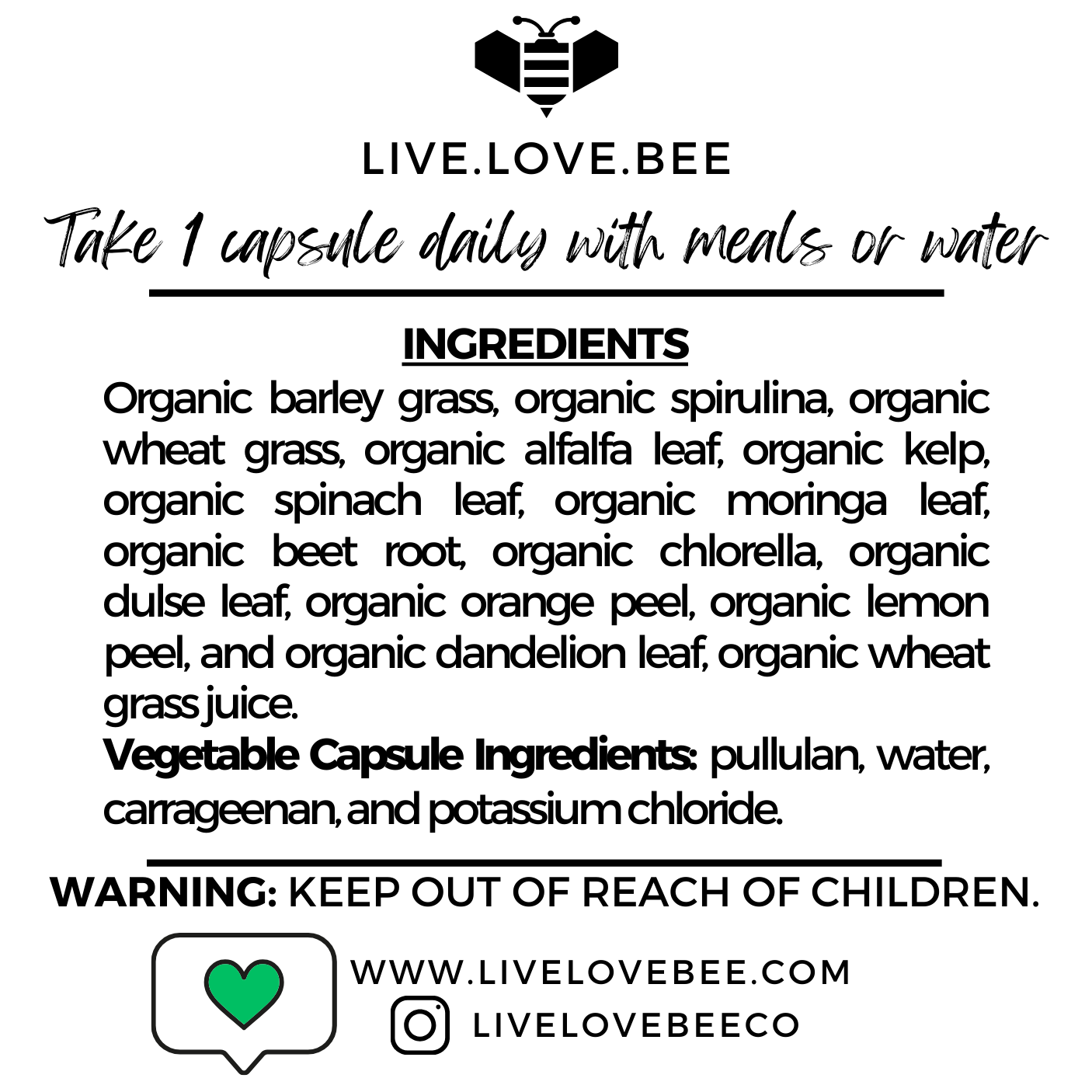 Ingredients: Organic barley grass, organic chlorella, organic wheat grass, organic spirulina, organic alfalfa leaf, organic moringa leaf, organic spinach leaf, organic kelp, organic dulse leaf, organic orange peel, organic beet root, organic wheat grass juice, organic lemon peel, and organic dandelion leaf. Vegetable Capsule Ingredients: Pullulan, water, carrageenan, and potassium chloride