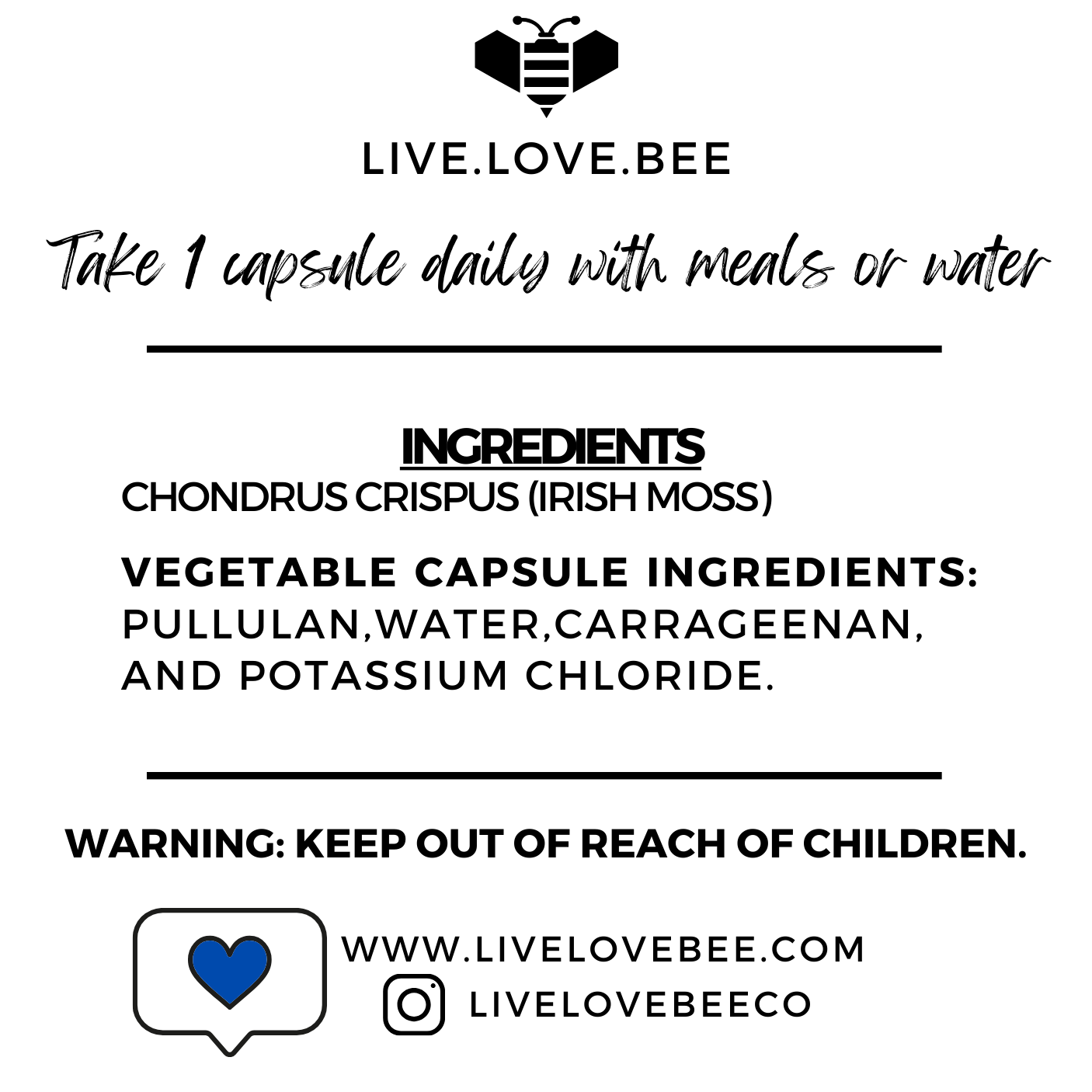 Ingredients: Irish Moss. Vegetable Capsule Ingredients: Pullulan, water, carrageenan, and potassium chloride