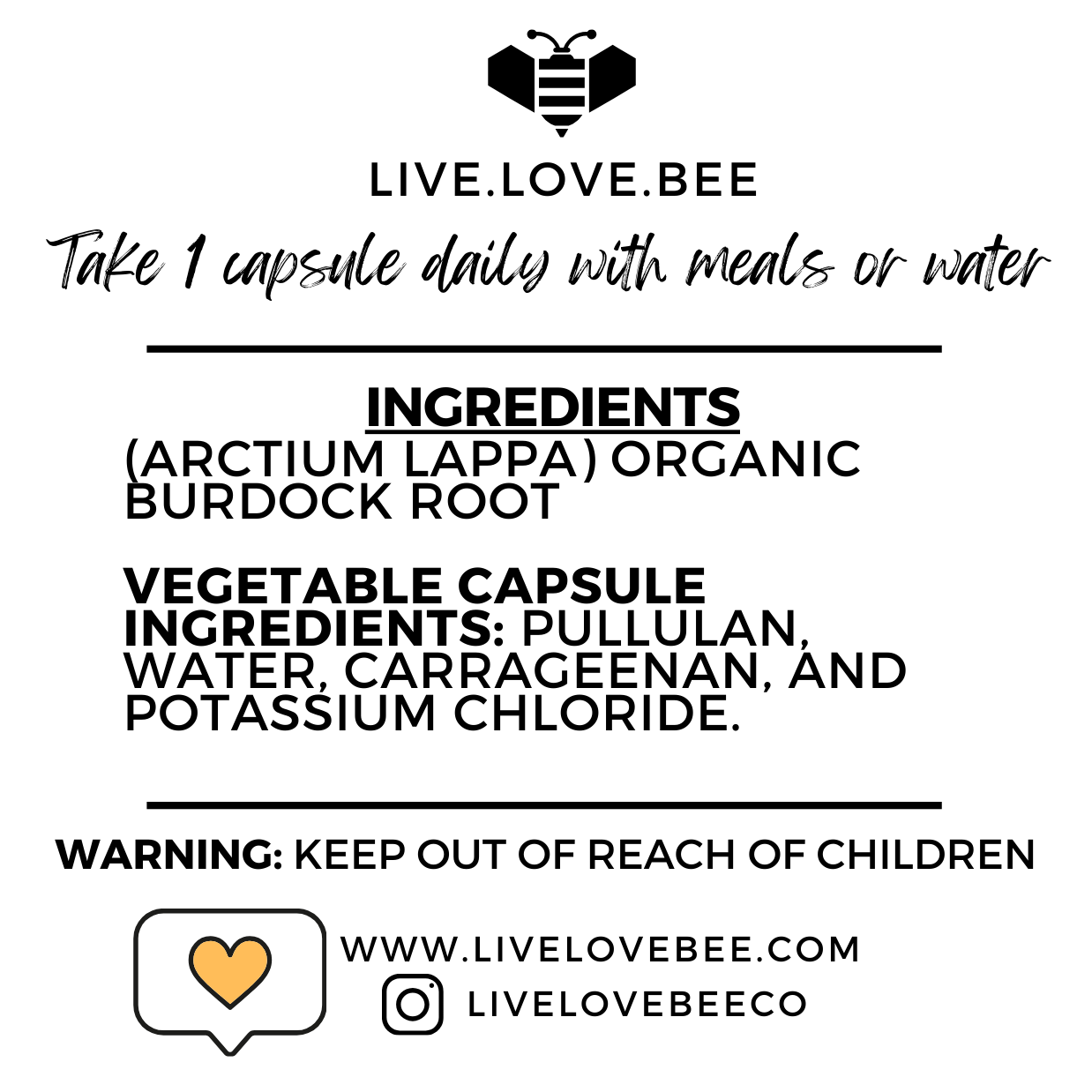 Ingredients: Organic Burdock Root. Vegetable Capsule Ingredients: Pullulan, water, carrageenan, and potassium chloride